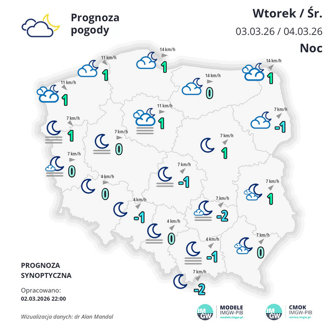 W nocy nadal zachmurzenie będzie małe, jedynie na północy miejscami pojawią się słabe opady deszczu. Temperatura minimalna od -2°C do 2°C, na obszarach podgórskich Karpat lokalnie -4°C. Wiatr słaby, nad morzem okresami umiarkowany, z kierunków zachodnich.
