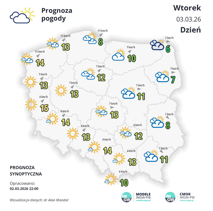 Wtorek zapowiada się słoneczny i ciepły. Temperatura maksymalna od 6°C, 7°C na północnym wschodzie, około 12°C w centrum do około 14°C, 15°C na południowym zachodzie i zachodzie kraju. Raczej słonecznie, choć mieszkańcy wschodnich muszą liczyć się z zachmurzeniami.