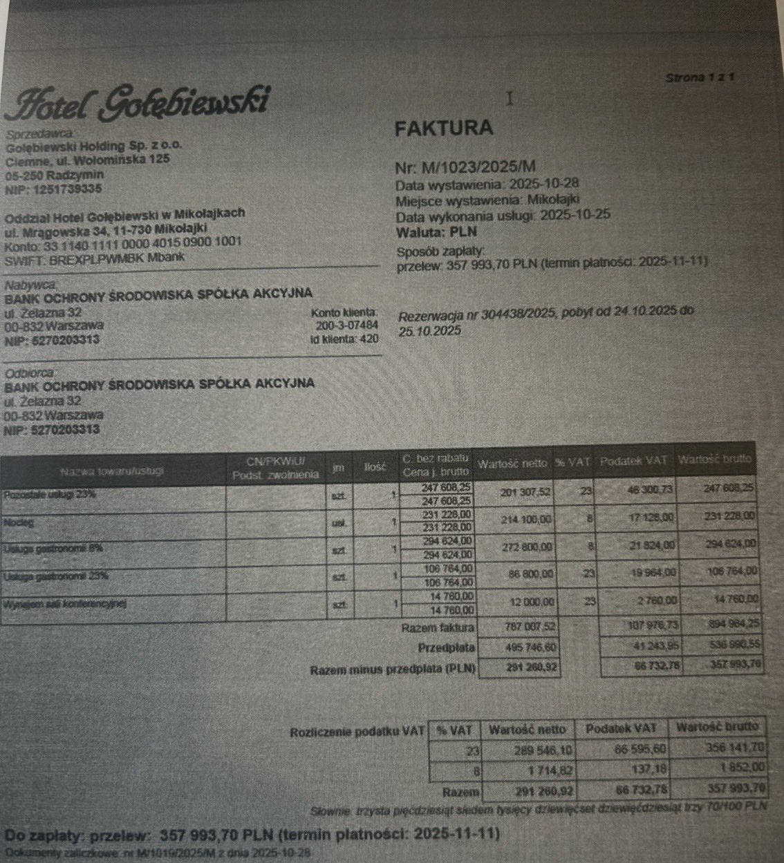 Faktura z Hotelu Gołębiewski dla BOŚ Banku (wydarzenie 24–25.10.2025) opiewa na 894 964,25 zł brutto. Dokument pokazuje m.in. koszty noclegów, usług gastronomicznych i wynajmu sali konferencyjnej