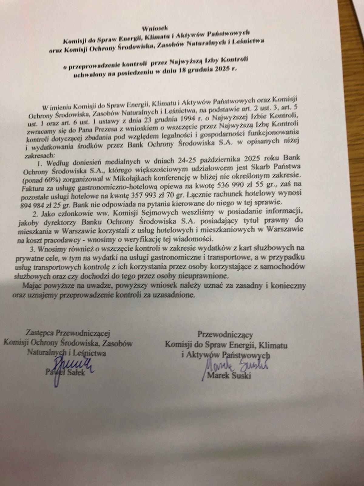Wniosek połączonych komisji sejmowych z 18 grudnia 2025 r. – posłowie żądają od NIK kontroli wydatków Banku Ochrony Środowiska, w tym kosztów feralnej konferencji w Mikołajkach: