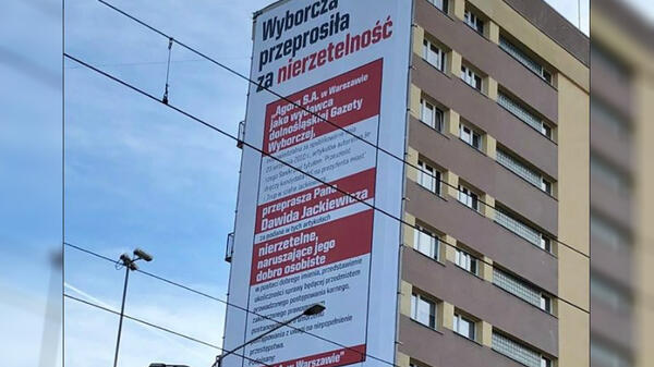„Wyborcza przeprosiła za nierzetelność” – gigantycznych rozmiarów baner z tą informacją zawisł na dziesięciopiętrowym budynku jednej z bardziej ruchliwych ulic Wrocławia (Grabiszyńska róg pl. Pereca). – W akcie desperacji wykupiłem największą siatkę, na jaką było mnie stać – mówi nam Dawid Jackiewicz, były minister skarbu w rządzie Beaty Szydło, którego sprawa dotyczy.