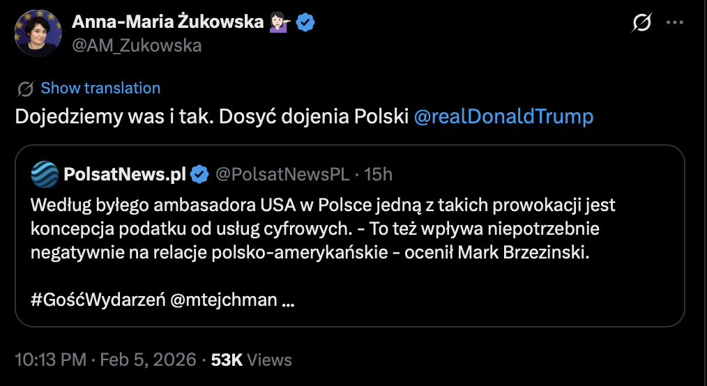 Według niego jedną z takich "prowokacji" jest... koncepcja podatku od usług cyfrowych. - To też wpływa niepotrzebnie negatywnie na relacje polsko-amerykańskie - ocenił.