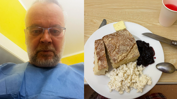 Do posta dołączył także zdjęcie posiłku, który otrzymał w szpitalu. Na talerzu widoczne są białe pieczywo, masło, twaróg oraz marmolada.