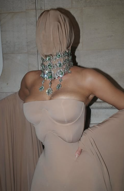 Jednak największą uwagę przyciągnęła Kim Kardashian, która na tę okazję wybrała beżową suknię od Maison Margiela, uzupełnioną dużą kolią. Najbardziej zaskakujący był jednak dodatek – maskę na twarzy, wyglądającą jak zaciągnięta rajstopa, przez co celebrytce konieczna była pomoc asystentki przy poruszaniu się. Stylizacja Kim natychmiast stała się hitem w mediach społecznościowych, a internautom trudno było oderwać wzrok od tego nietypowego wyglądu.