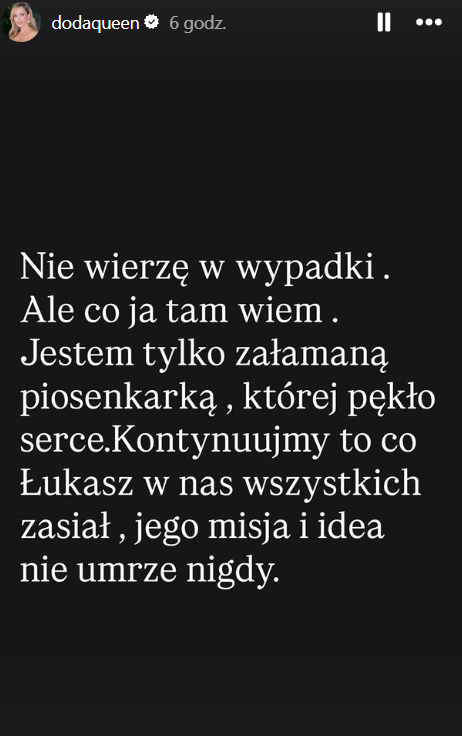 „Jeszcze przed obiadem żartowaliśmy... Nic się nie martw, wszystko dokończę. Widzimy się w kolejnym wcieleniu. Nie wierzę w wypadki. Ale co ja tam wiem. Jestem tylko załamaną piosenkarką, której pękło serce. Kontynuujmy to, co Łukasz w nas wszystkich zasiał, jego misja i idea nie umrze nigdy.”