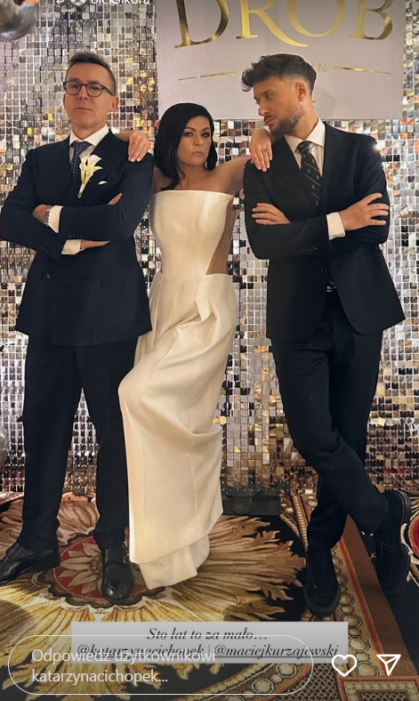 Podczas ceremonii Kasia zachwyciła w dopasowanej sukni z dekoltem w kształcie litery V, autorstwa Violi Piekut. Jak zdradziła projektantka, Cichopek od razu wybrała właśnie tę kreację, ponieważ łączyła spokój formy, subtelną siłę i nowoczesną elegancję.