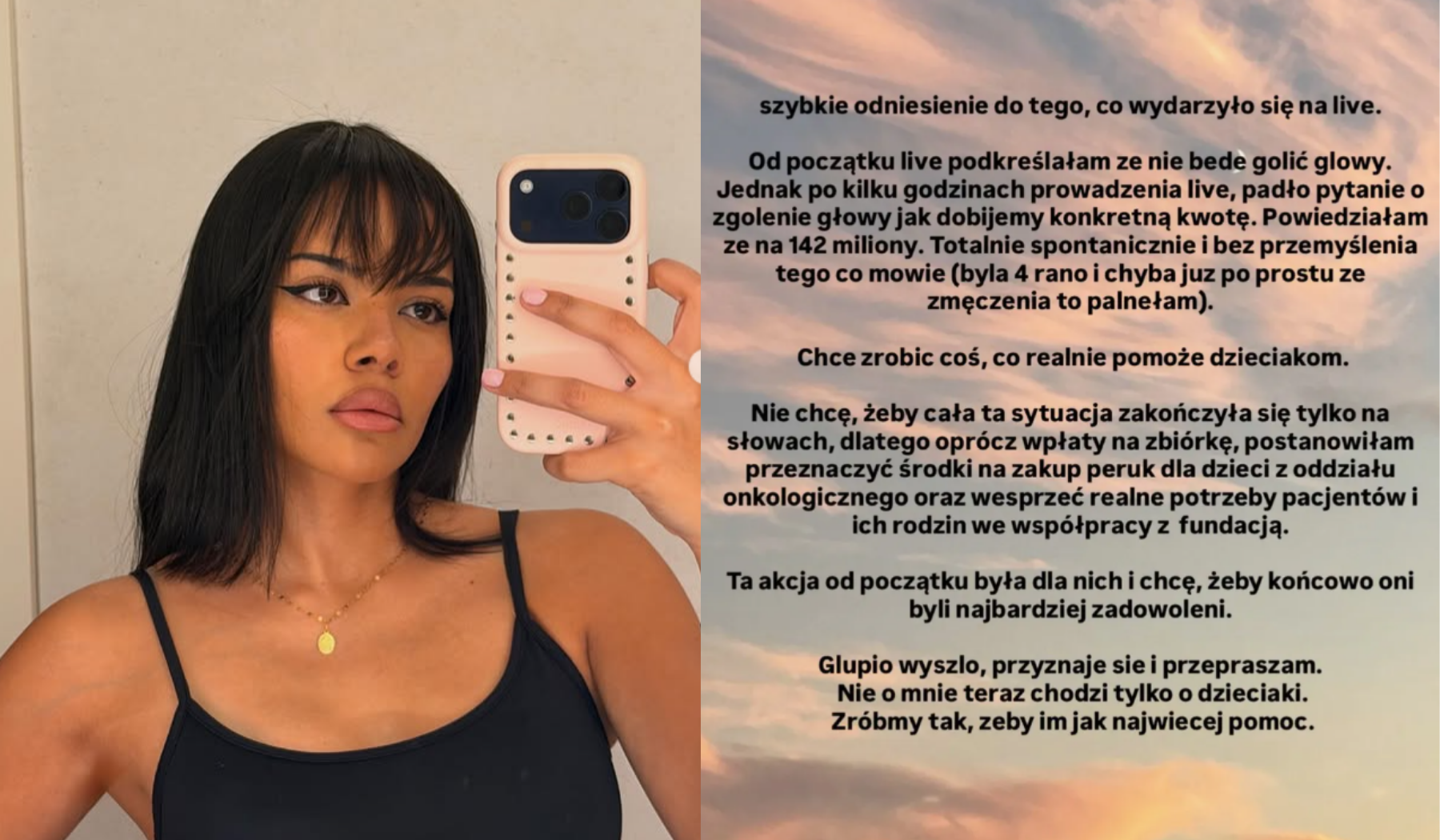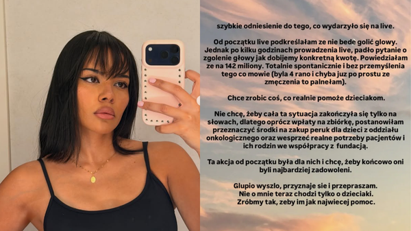 „Chcę zrobić coś, co realnie pomoże dzieciakom. Nie chcę, żeby cała ta sytuacja zakończyła się tylko na słowach, dlatego oprócz wpłaty na zbiórkę, postanowiłam przeznaczyć środki na zakup peruk dla dzieci z oddziału onkologicznego oraz wesprzeć realne potrzeby pacjentów i ich rodzin we współpracy z fundacją. Ta akcja od początku była dla nich i chcę, żeby końcowo oni byli najbardziej zadowoleni. Głupio wyszło, przyznaję się i przepraszam. Nie o mnie teraz chodzi, tylko o dzieciaki. Zróbmy tak, żeby im, jak najwięcej pomóc - podsumowała.”