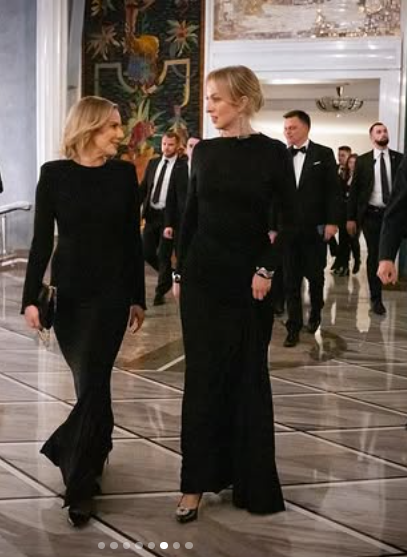 Para prezydencka zaprezentowała się niezwykle szykownie. Pierwsza Dama postawiła na długą, czarną suknię o klasycznym kroju, którą uzupełniła eleganckim futrem w tym samym kolorze oraz małą torebką-puzderkiem. Jej stylizacja emanowała ponadczasowym urokiem i doskonałym wyczuciem smaku. Prezydent RP wybrał tradycyjny smoking, białą koszulę i czarną muchę, prezentując się w pełni dostojnie.