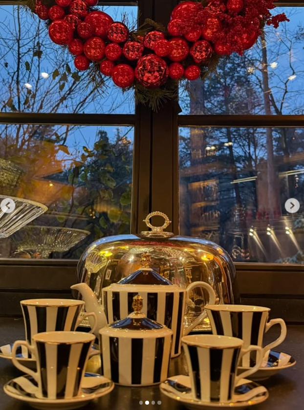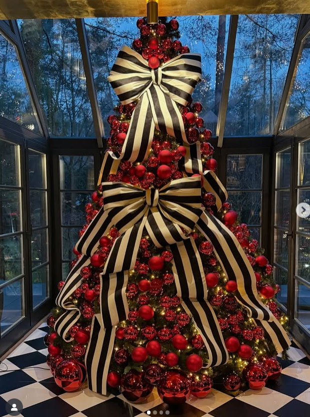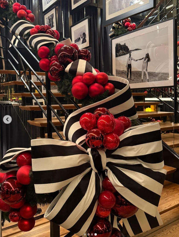 Tuż przed początkiem grudnia projektantka zaprezentowała najnowszą odsłonę świątecznych dekoracji w swoim domu. W centrum uwagi znalazła się duża choinka, ozdobiona czerwonymi bombkami o różnych fakturach i rozmiarach. Charakterystycznym elementem tegorocznej aranżacji są szerokie biało-czarne kokardy, które pojawiają się nie tylko na choince, ale także na dekoracyjnej girlandzie oplatającej schody.