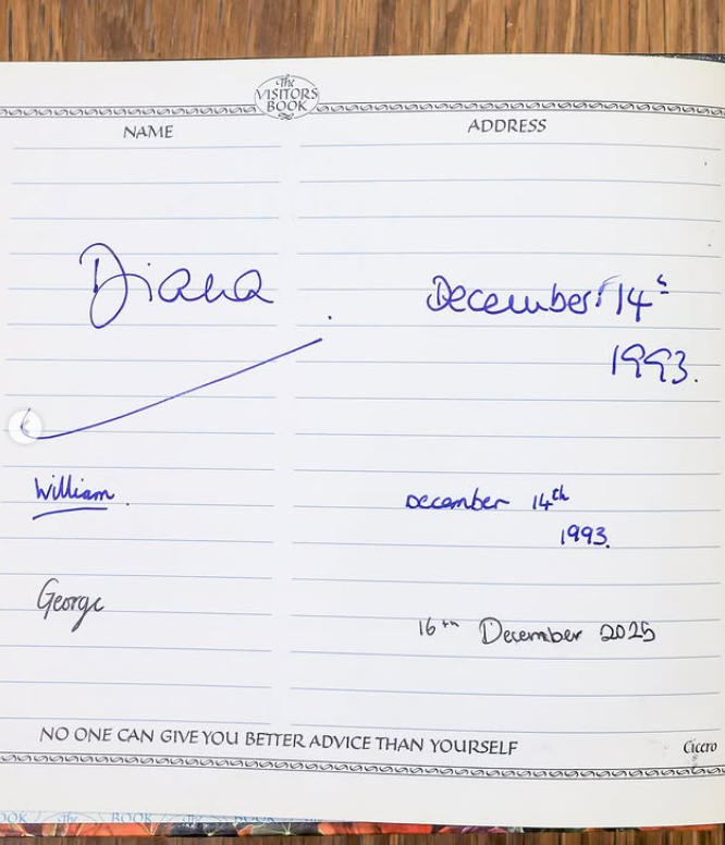 William zestawił archiwalne zdjęcie z 1993 roku z aktualnym kadrem, pokazując, jak ważna jest dla niego ciągłość tradycji i pamięć o matce. Dodatkowo zaprezentował wpisy pozostawione w księdze gości – zarówno ten sprzed lat, jak i nowy, podpisany wspólnie z synem.