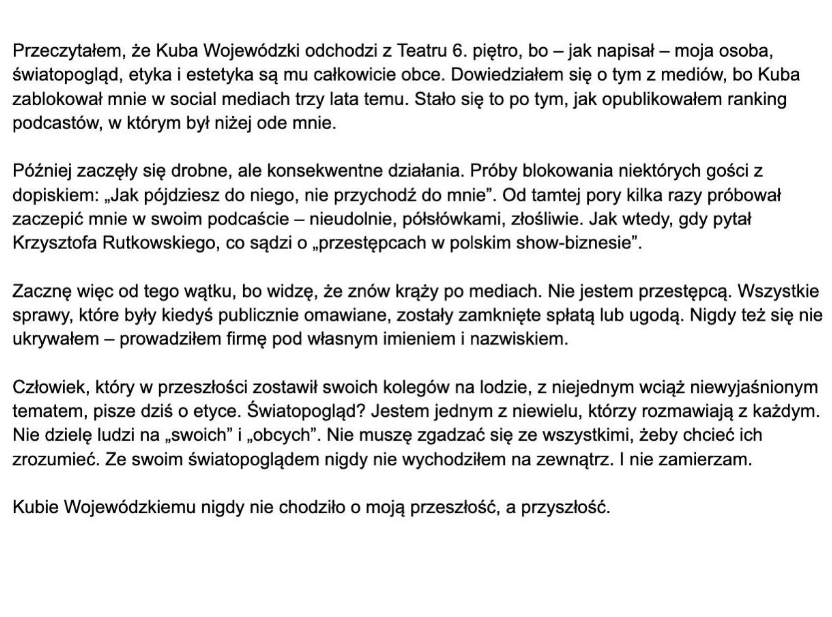 „Przeczytałem, że Kuba Wojewódzki odchodzi z Teatru 6. piętro, bo – jak napisał – moja osoba, światopogląd, etyka i estetyka są mu całkowicie obce. Dowiedziałem się o tym z mediów, bo Kuba zablokował mnie w social mediach trzy lata temu” – zaczyna swoją relację Żurnalista.