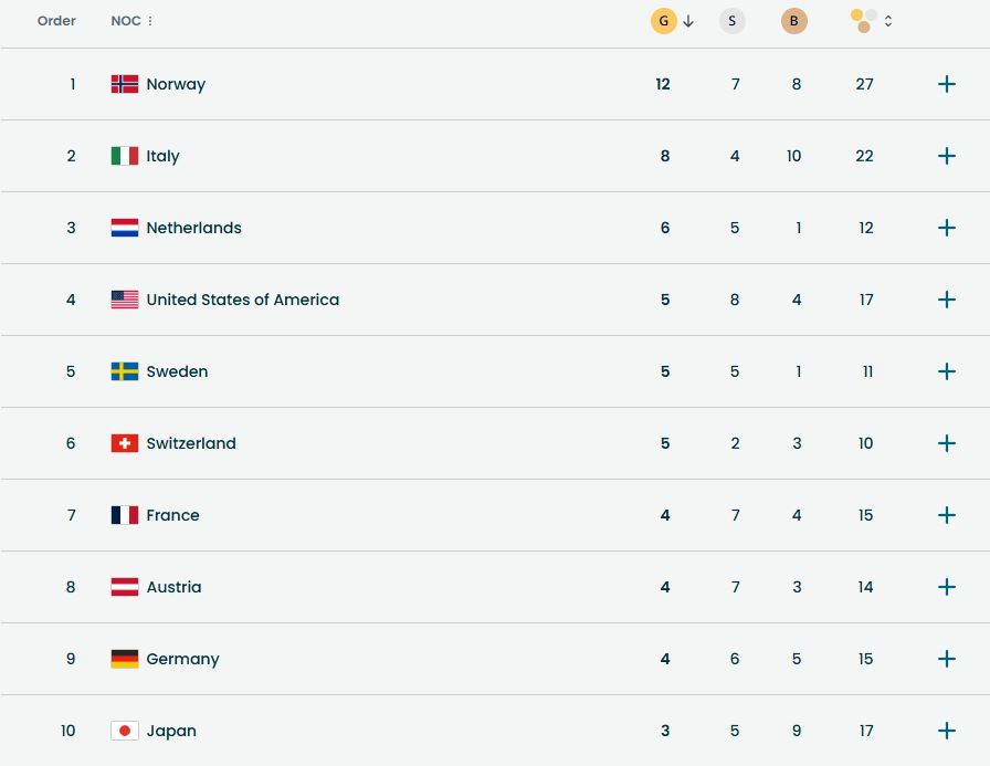W tabeli medalowej tegorocznych igrzysk Włosi zajmują obecnie drugie miejsce. Wyprzedza ich jedynie Norwegia z dorobkiem 27 medali, w tym 12 złotych (stan na 16 lutego godz. 16:50). Wszystko wskazuje na to, że gospodarze mają jeszcze szansę poprawić swój historyczny wynik.