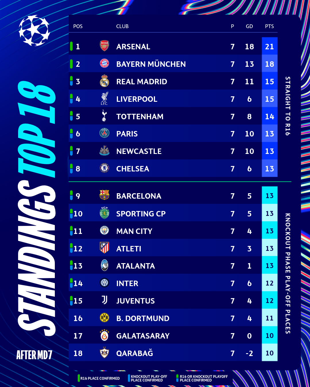 Po zakończeniu fazy ligowej osiem najlepszych zespołów zapewni sobie bezpośredni awans do 1/8 finału, dwanaście drużyn pożegna się z rozgrywkami, a zespoły z miejsc 9–24 trafią do rundy barażowej. Losowanie odbędzie się bez jakichkolwiek ograniczeń geograficznych. Możliwe są więc starcia drużyn z tej samej federacji oraz ponowne mecze ekip, które rywalizowały już ze sobą w fazie ligowej.