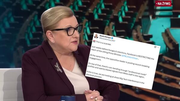 Doradca prezydenta Beata Kempa alarmuje na platformie X, że inny globalny serwis społecznościowy, Facebook, tnie zasięgi Victora Orbana, premiera Węgier i szefa partii Fidesz. Nie dzieje się to przez przypadek, bowiem Węgrzy już 12 kwietnia udadzą się do urn i wybiorą nowych parlamentarzystów.