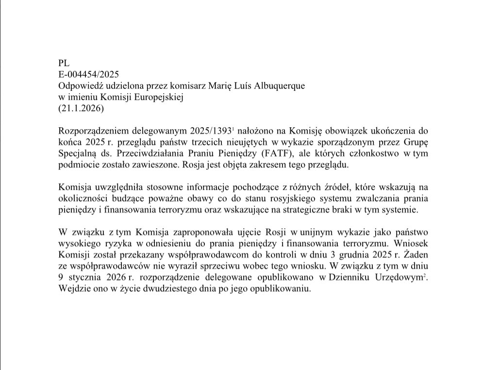 – Przez ponad rok podejmowałem działania, by Rosja została wpisana na unijną listę państw trzecich wysokiego ryzyka w zakresie prania pieniędzy i finansowania terroryzmu – napisał europoseł Mariusz Kamiński. – Komisja Europejska właśnie poinformowała, że podjęła stosowne decyzje – dodał.