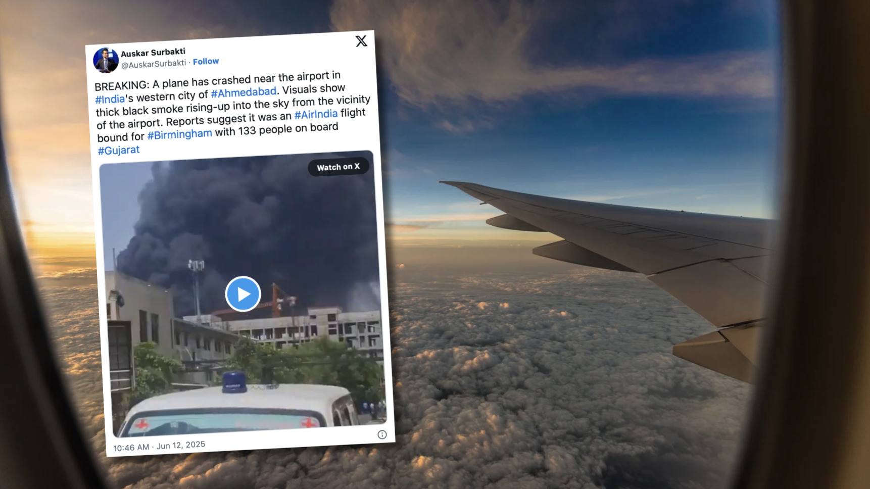 Na materiałach pokazanych w telewizji widać płonące fragmenty samolotu oraz gęsty, czarny dym unoszący się nad lotniskiem.