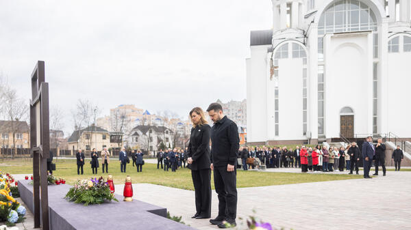 Zełenski wraz z małżonką Ołeną i przedstawicielami ukraińskich władz uczcił pamięć zabitych przy ścianie ich pamięci. Znajduje się ona na terytorium cerkwi, przy której w zbiorowej mogile chowano ludzi, zbieranych w Buczy wprost z ulic.