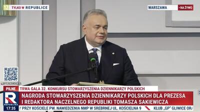 Podczas Gali 32. Konkursu Dziennikarskiego z Nagrodami SDP, prezes Telewizji Republika Tomasz Sakiewicz otrzymał Laur SDP. Z kolei za przygotowanie i prowadzenie debat prezydenckich wyemitowanych w TV Republika w 2025 roku Nagrodę Wolności Słowa SDP otrzymała Katarzyna Gójska. - Mam sporo do zrobienia, co pewnie wielu ludzi nie ucieszy, bo mamy parę pomysłów, które mogą tu mocno zamieszać - mówił Tomasz Sakiewicz.