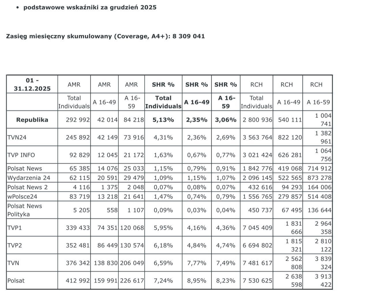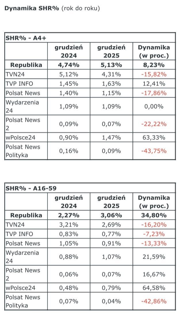 Z najnowszych analiz firmy badawczej Nielsen wynika, że w grudniu 2025 roku Telewizja Republika była najchętniej oglądaną telewizją informacyjną w Polsce.