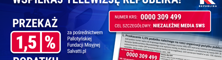 WAŻNEWspieraj Telewizję Republika! Przekaż 1,5 procent podatku za pośrednictwem Pallotyńskiej Fundacji Misyjnej "Salvatti.pl". Nr KRS: 0000 309 499. Cel szczegółowy: Niezależne Media SWS