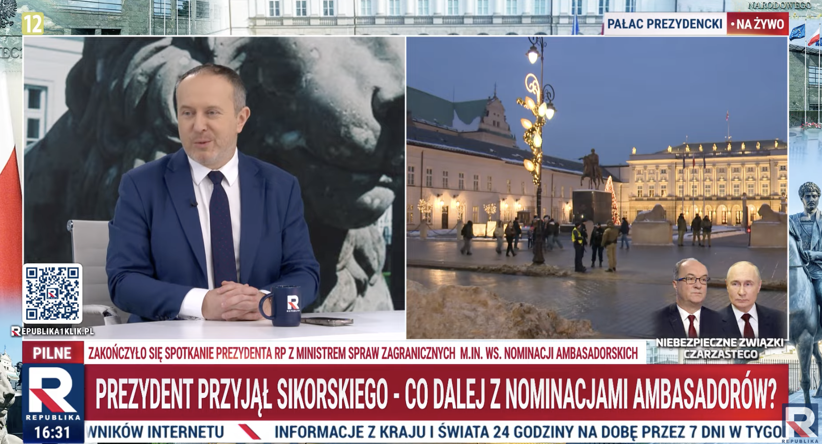 Adrian Klarenbach zaprasza na program "Republika Wieczór". O godz. 21:00 gośćmi będą: Olga Semeniuk-Patkowska (Prawo i Sprawiedliwość), Paweł Lech (Koalicja Obywatelska), Dobromir Sośnierz (Konfederacja), Piotr Bakun (Nowa Fala), Oskar Kida (Republikanie)
